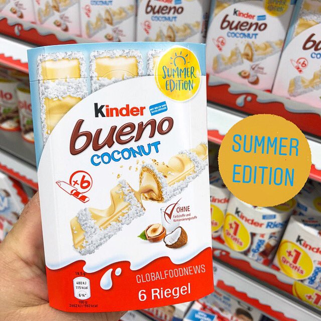 White chocolate and coconut Kinder Bueno bars disappeared from UK shops in 2017. According to Ferrero the coconut flavoured Kinder Bueno is a tropical chocolate blend featuring smooth hazelnut cream encased in a coconut milk and white chocolate.
